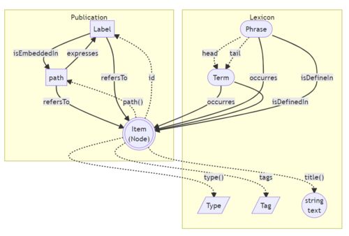 flowchart TB subgraph syntax[Lexicon] term([Term]) phrase([Phrase]) type[/Type/] tag[/Tag/] string(("string\ntext")) phrase-.->|head| term phrase-.->|tail| term end subgraph publication[Publication] label[Label] item((("Item\n(Node)"))) pa…